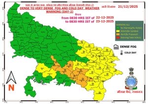 - 22-12-2025: पश्चिमी/पूर्वी हिस्से में मौसम शुष्क व साफ रहने की संभावना है। इस दौरान पश्चिमी व पूर्वी यूपी में कहीं कहीं घने से अति घना कोहरा छाने व शीतदिवस की संभावना जताई गई है।