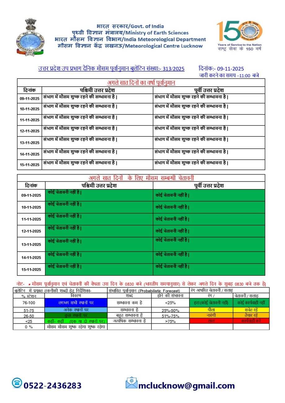 - 9-11-2025: पश्चिमी / पूर्वी यूपी में मौसम शुष्क