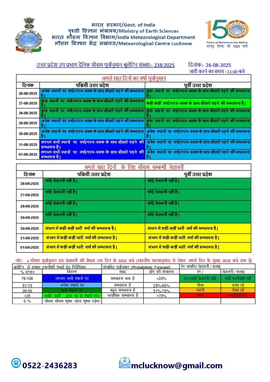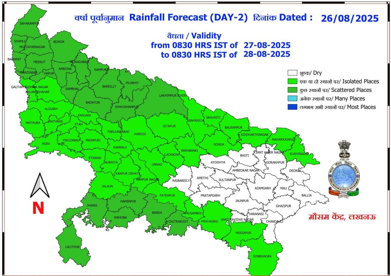 - 27-08-2025: पश्चिमी में कुछ/ पूर्वी यूपी में कहीं कहीं स्थानों पर वर्षा/गरज-चमक के साथ बौछारें ।