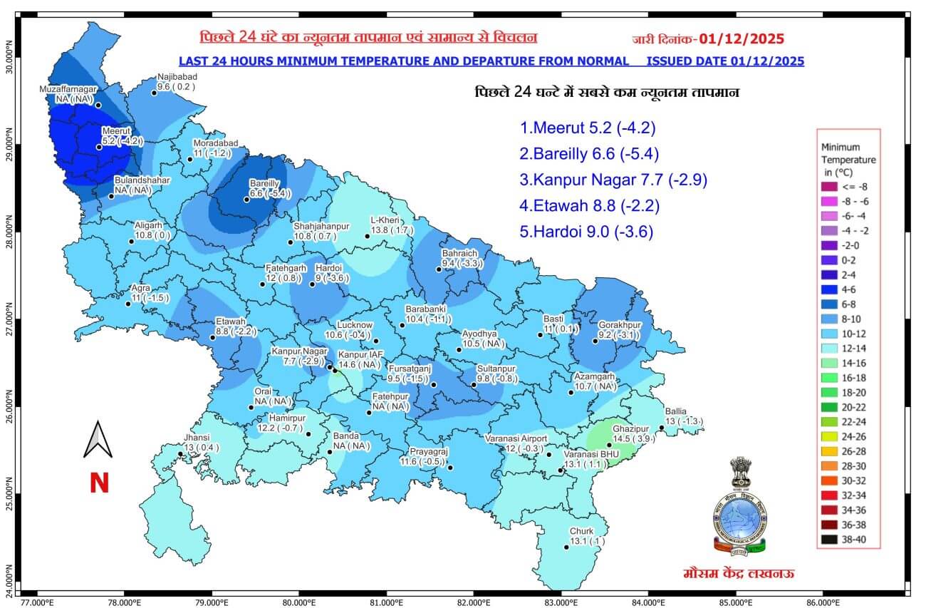 प्रदेश में सबसे कम न्यूनतम तापमान बरेली में 8 डिग्री सेल्सियस दर्ज किया गया है। सबसे कम अधिकतम तापमान बुलंदशहर में 22 डिग्री सेल्सियस दर्ज किया गया है।