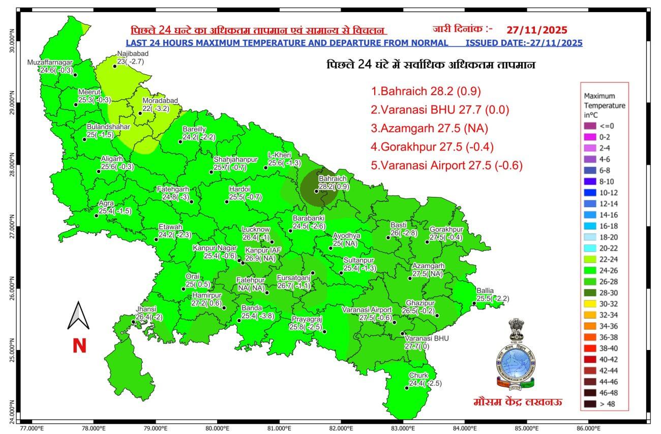 वर्तमान में प्रदेश में कोई मजबूत मौसम प्रणाली सक्रिय नहीं है, लेकिन पछुआ/उत्तरी-पश्चिमी शुष्क हवाओं के चलने से तापमान में गिरावट हो रही है।28 नवंबर से 3 दिसंबर 2025 को प्रदेश में मौसम शुष्क रहने के साथ ही सुबह के समय छिछले से मध्यम कोहरा छाने की संभावना है। अगले 3 दिनों में न्यूनतम तापमान में करीब 2 डिग्री सेल्सियस की बढ़ोतरी होने की संभावना हैं। आज लखनऊ में अधिकतम तापमान 26 डिग्री और न्यूनतम 11 डिग्री सेल्सियस रहने का अनुमान है।