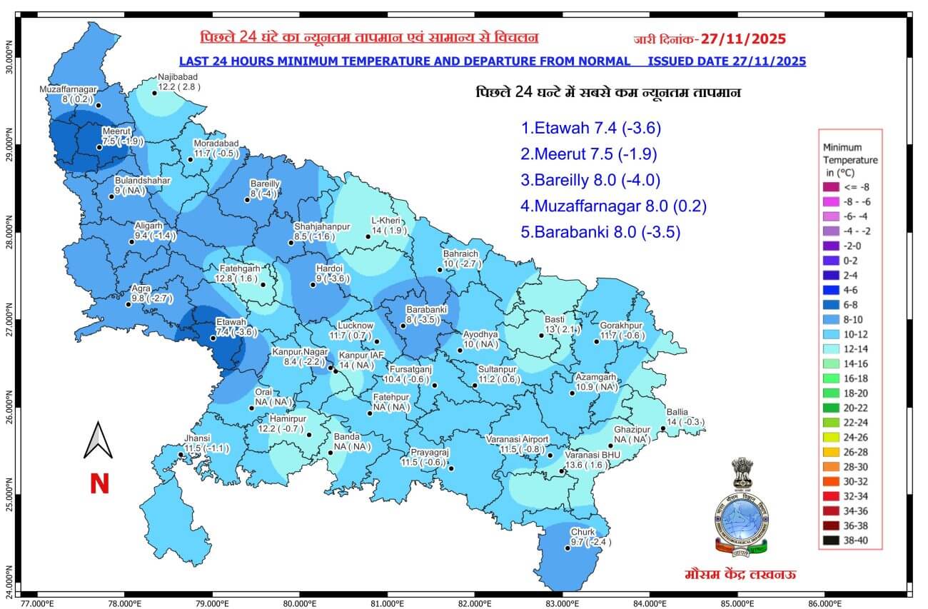 • बाराबंकी का न्यूनतम तापमान 7.5 डिग्री, अलीगढ़ का 7.6 डिग्री, मुजफ्फरनगर का 7.9 डिग्री और मेरठ का 8.1 डिग्री सेल्सियस दर्ज किया गया।
