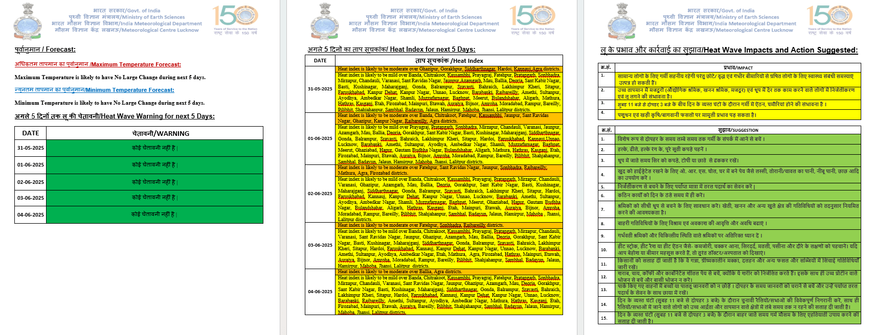 - यूपी के दक्षिणी हिस्सों में शामिल जिलों में कानपुर नगर, कानपुर देहात, आगरा, फिरोजाबाद,इटावा, चित्रकूट, झांसी, बांदा और फतेहपुर और शाहजहांपुर, बस्ती, श्रावस्ती, सिद्धार्थनगर, बलरामपुर, सीतापुर और गोरखपुर समेत उत्तरी यूपी के जिलों में ऑरेंज अलर्ट जारी किया गया है।