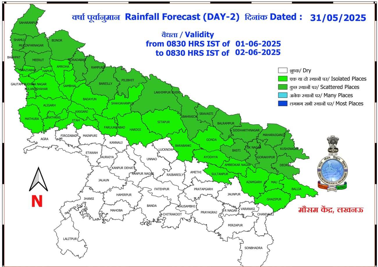 पश्चिमी विक्षोभ के असर से आज 1 जून को 50 जिलों में हल्की से मध्यम बारिश का अलर्ट जारी किया गया है। अगले 5 दिनों के दौरान अधिकतम तापमान और न्यूनतम तापमान में अगले 5 दिनों के दौरान कोई बड़ा परिवर्तन होने की संभावना नहीं है।आने वाले दिनों में तापमान में कुछ गिरावट दर्ज की जाएगी।