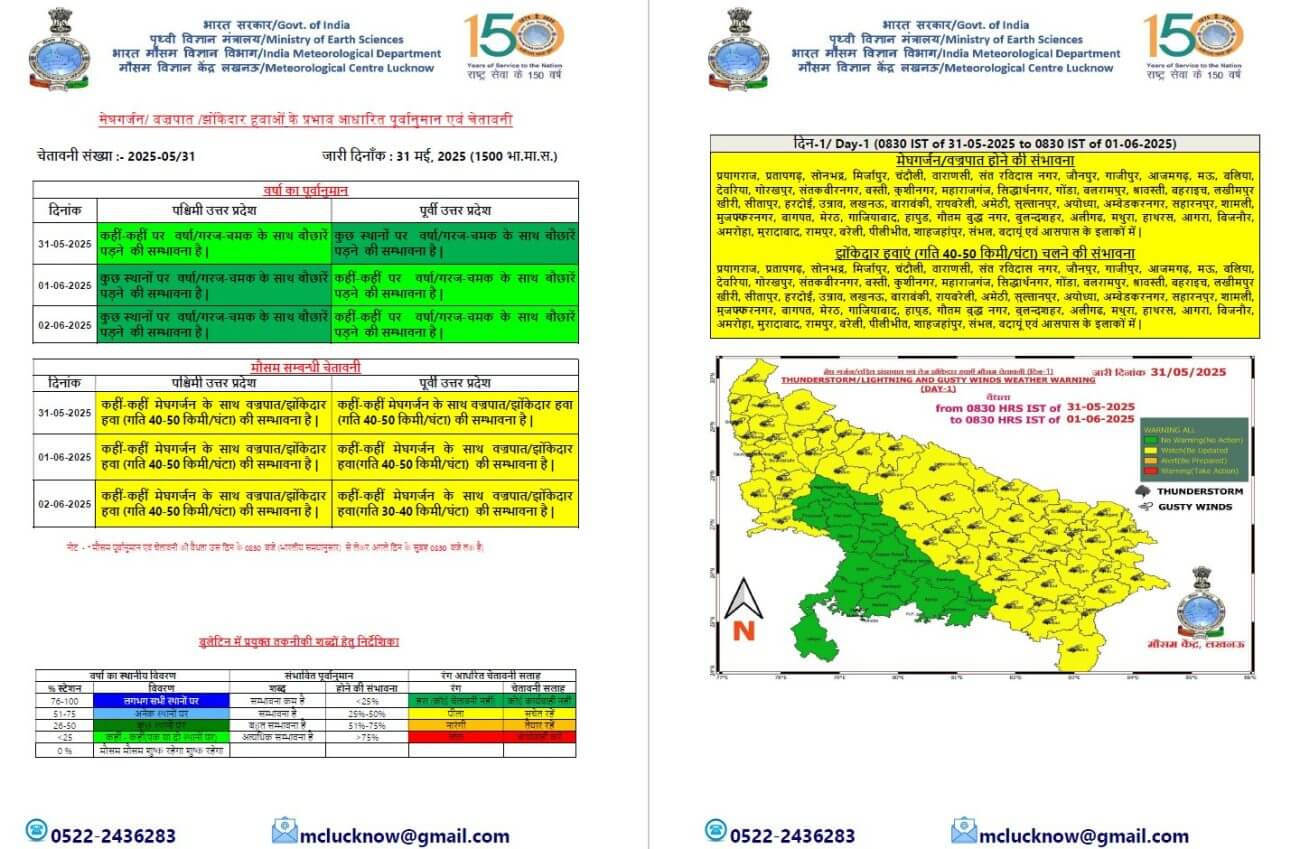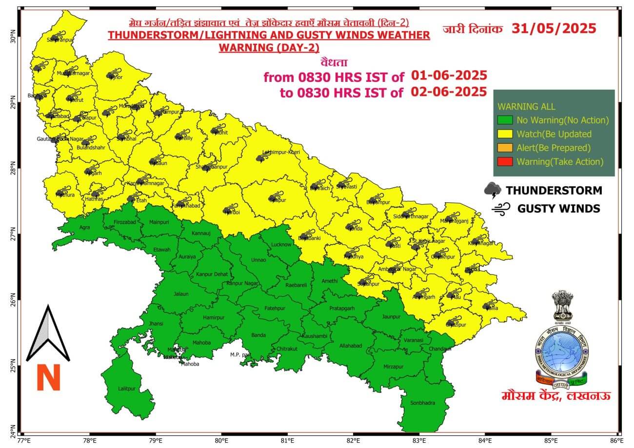 - मुजफ्फरनगर, बागपत, मेरठ, गाजियाबाद, हापुड़ और बिजनौर , गौतम बुद्ध नगर, बुलन्दशहर, अलीगढ, मथुरा, हाथरस, कासगंज, एटा, अमरोहा, मुरादाबाद, रामपुर, बरेली, पीलीभीत, शाहजहांपुर, संभल, बदायूं और उसके आसपास के इलाकों में बादल गरजने व बिजली चमकने के साथ ही 40 से 50 किलोमीटर प्रति घंटा की रफ्तार से झोंकेदार हवा चल सकती है।