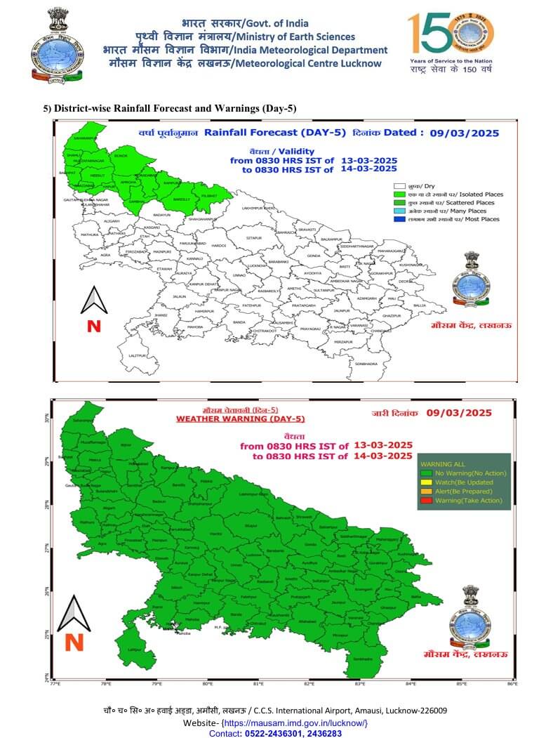 - 13 मार्च को पश्चिमी यूपी में कहीं-कहीं पर हल्की से हल्की बारिश होने की संभावना है। पूर्वी यूपी में इस दौरान मौसम साफ रह सकता है।