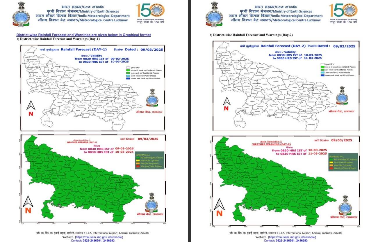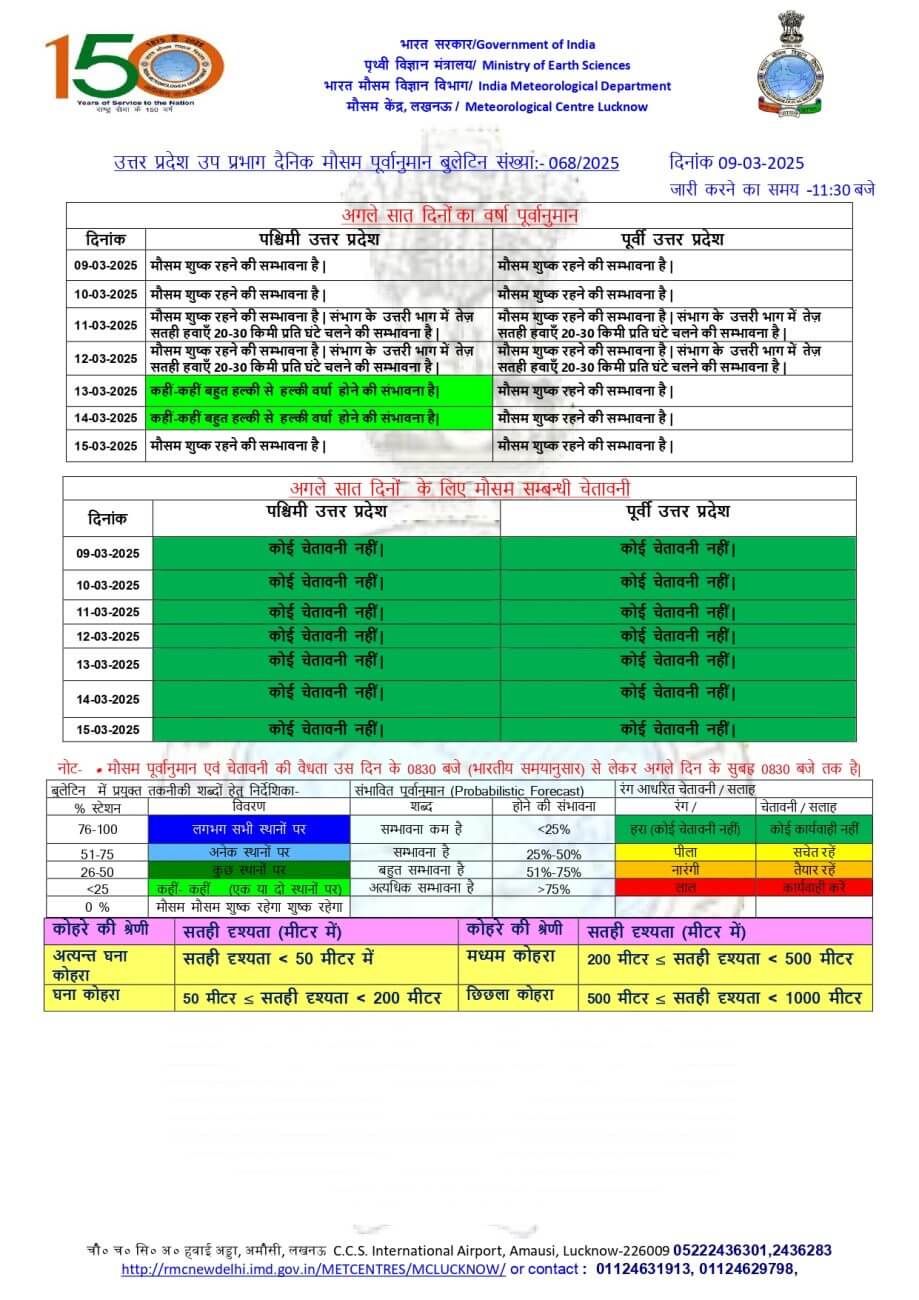 - 11 मार्च को मौसम साफ रहने के साथ पश्चिमी और पूर्वी यूपी में 20 से 30 किलोमीटर प्रति घंटा की रफ्तार से तेज हवा चलने की संभावना है।