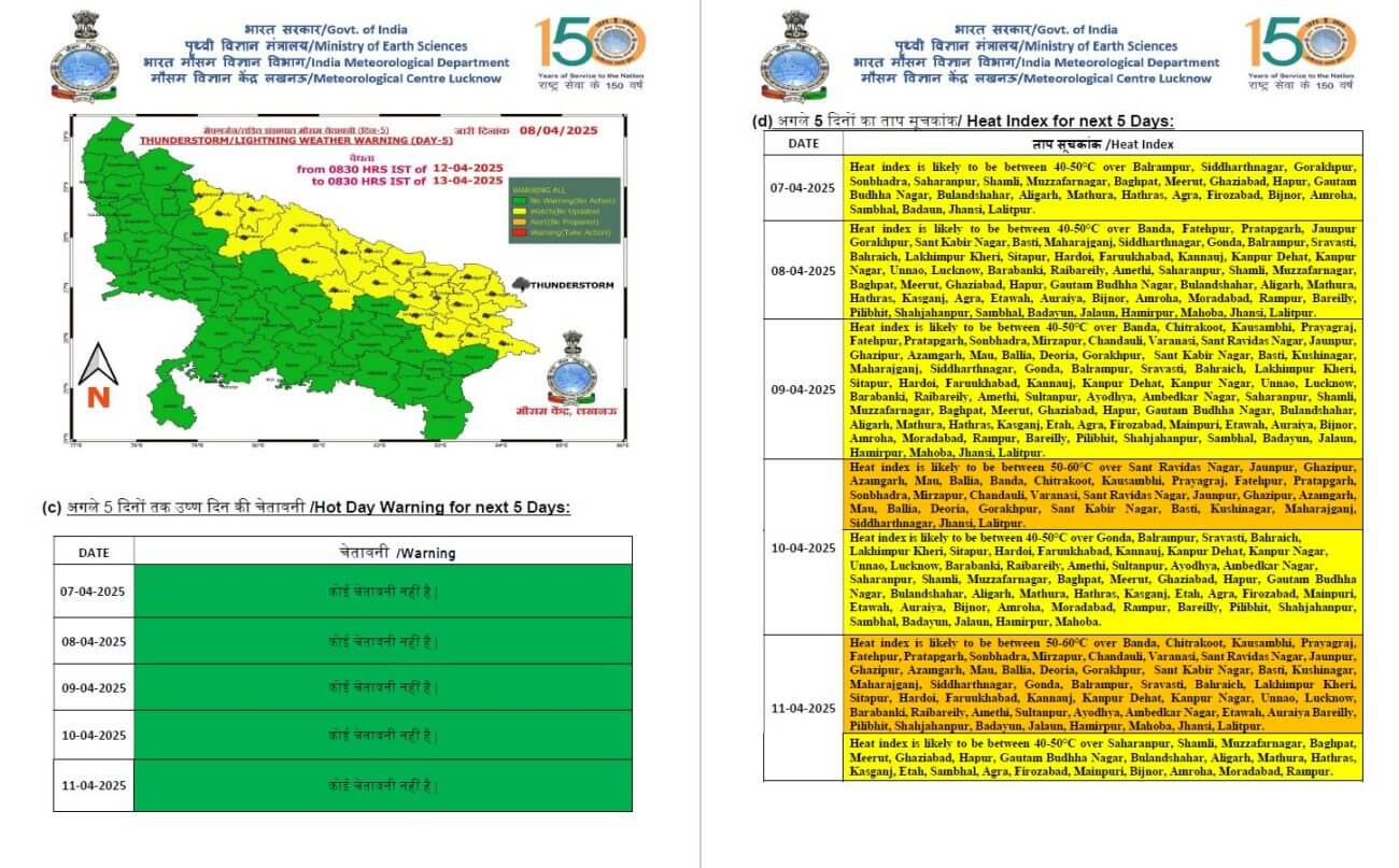 - 10 अप्रैल को प्रदेश के दोनों हिस्सों में कुछ स्थानों पर बारिश और गरज चमक के साथ बौछारें के आसार है।9- 10 अप्रैल के बीच देवरिया, गोरखपुर, संतकबीरनगर, बस्ती, कुशीनगर, महाराजगंज, सिद्धार्थनगर और आसपास के कुछ जिलों में गरज-चमक के साथ बारिश और वज्रपात की संभावना जताई गई है।