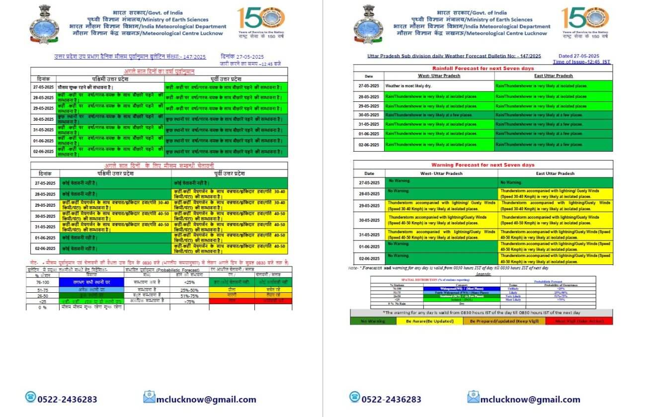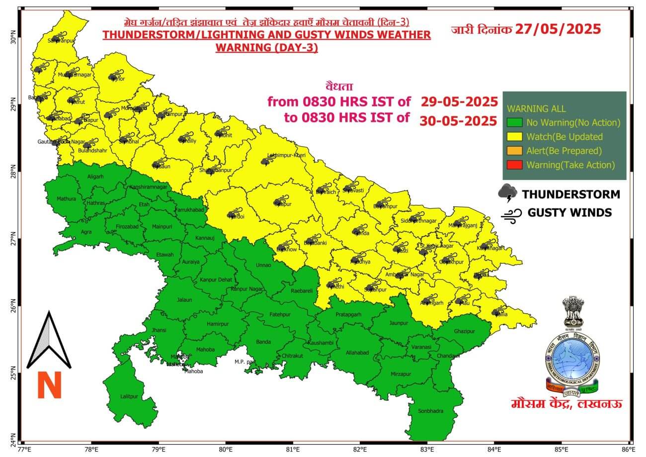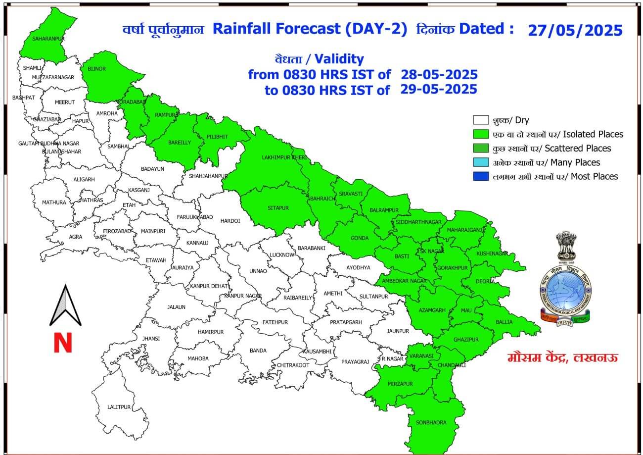 29 से 31 मई तक प्रदेश के दोनों हिस्सों में कहीं-कहीं बारिश और गरज-चमक के साथ बौछारें पड़ सकती है जबकि 1 जून पश्चिमी यूपी में मौसम साफ तो पूर्वी यूपी में कहीं-कहीं बारिश हो सकती है।केरल में पहुंचने के बाद अब UP में भी इस बार मानसून समय से पहले 18 जून तक दस्तक दे सकता है। वही जून से सितंबर के बीच सामान्य से अधिक वर्षा होने के आसार है।
