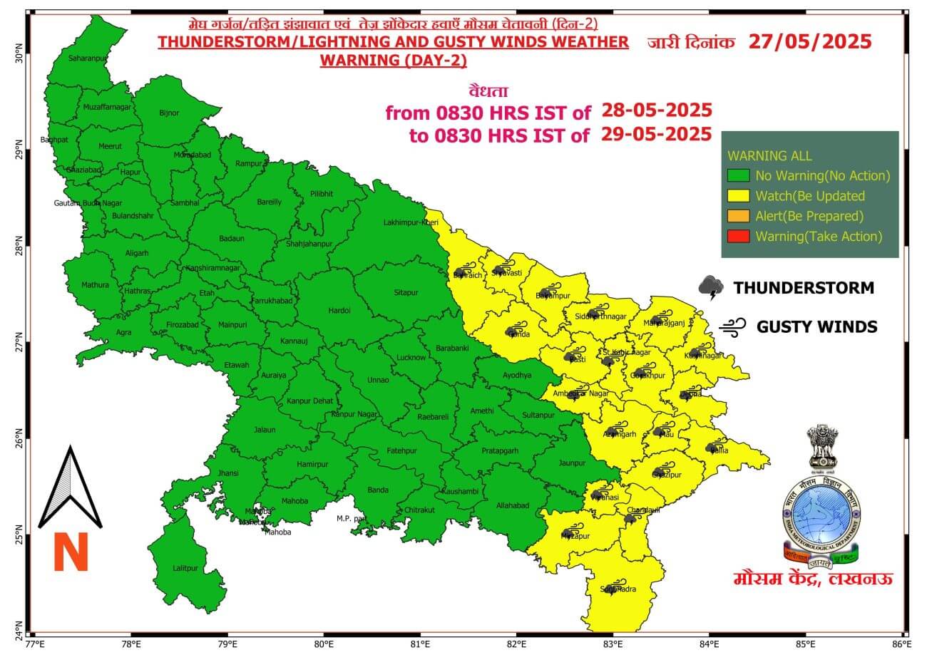 बलिया, देवरिया, गोरखपुर, संतकबीरनगर, बस्ती, कुशीनगर, महाराजगंज, मऊ, चित्रकूट, प्रयागराज, सोनभद्र, मिर्जापुर, गोंडा, वाराणसी, संतरविदास नगर, गाजीपुर, महोबा, चंदौली, बांदा, सिद्धार्थनगर, बलरामपुर, बहराइच, ललितपुर,श्रावस्ती उसके आसपास के इलाके में बारिश और गरज-चमक के साथ 30 से 40 किलोमीटर प्रति घंटा की रफ्तार से झोंकेदार हवा चल सकती है।
