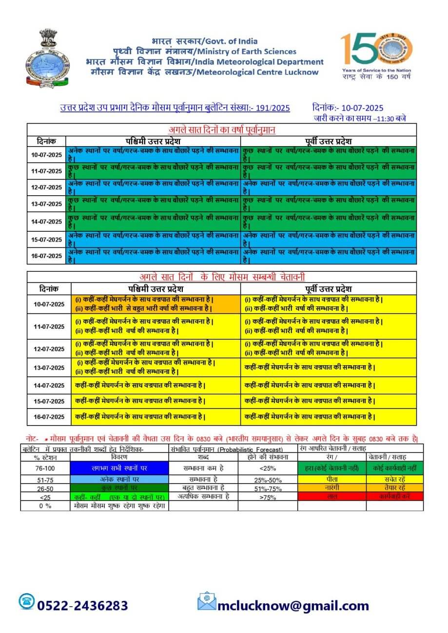 - 11-07-2025: पश्चिमी / पूर्वी यूपी में कुछ स्थानों पर वर्षा/गरज-चमक के साथ बौछारें ।कहीं-कहीं भारी बारिश/ मेघगर्जन के साथ वज्रपात।