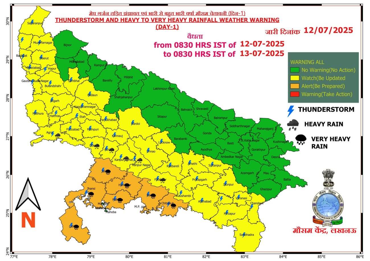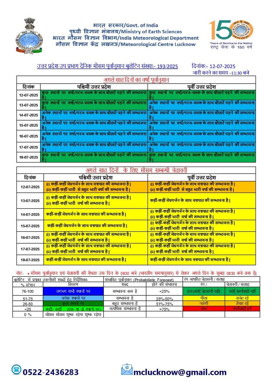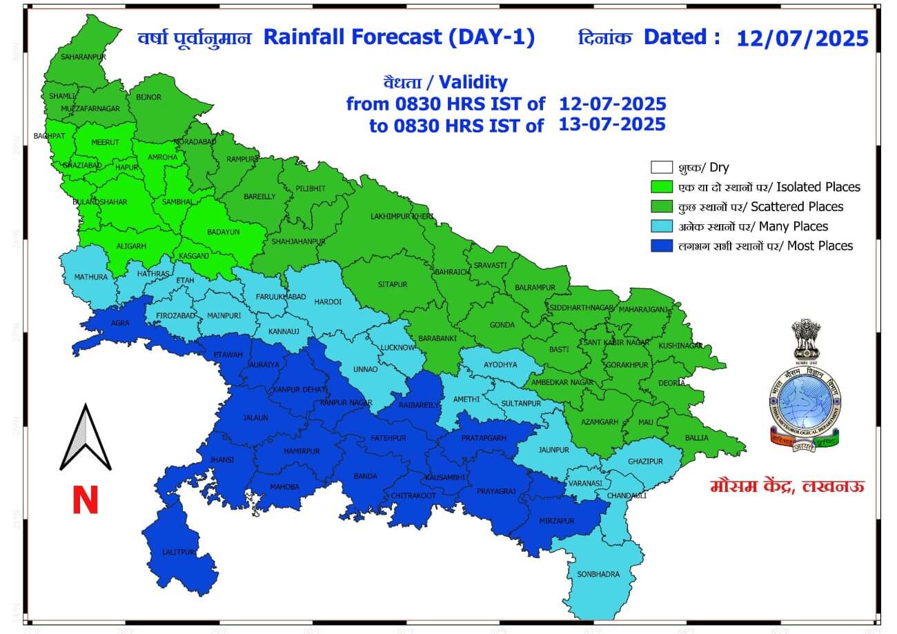 - 12-07-2025: पश्चिमी / पूर्वी यूपी में अनेक स्थानों पर वर्षा/गरज-चमक के साथ बौछारें ।कहीं-कहीं भारी बारिश/ मेघगर्जन के साथ वज्रपात।