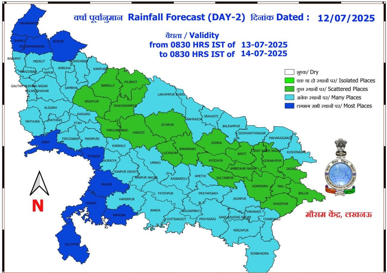 - 13-07-2025: पश्चिमी / पूर्वी यूपी में कुछ स्थानों पर वर्षा/गरज-चमक के साथ बौछारें ।कहीं-कहीं भारी बारिश/ मेघगर्जन के साथ वज्रपात।