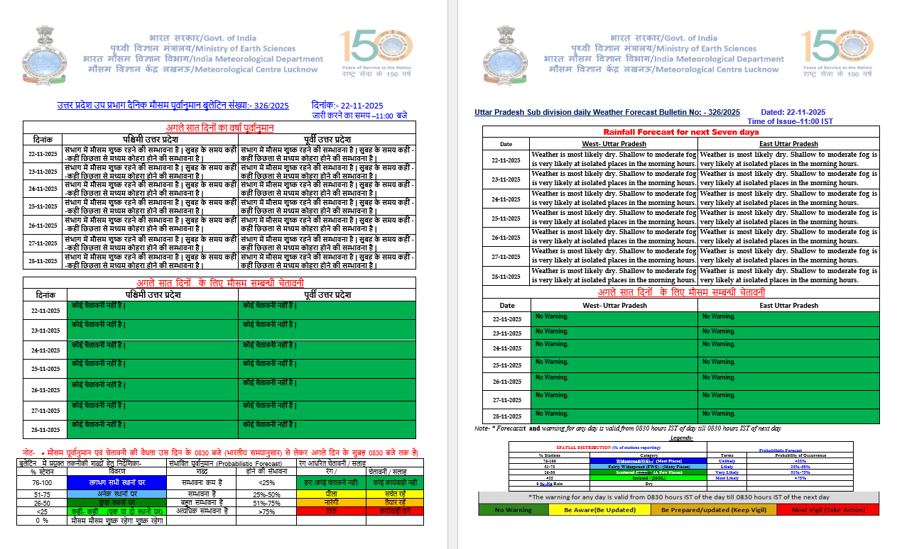 - 23-11-2025: पश्चिमी/पूर्वी हिस्से में मौसम शुष्क/ दोनों हिस्सों में सुबह के समय कहीं-कहीं पर छिछला से मध्यम कोहरा