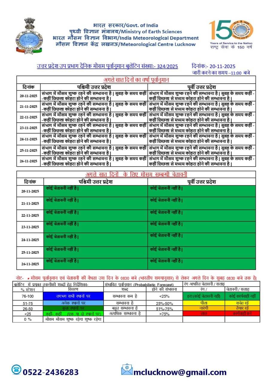लखनऊ मौसम केन्द्र के मुताबिक,वर्तमान में बंगाल की खाड़ी की ओर से आ रही पुरवा हवाओं के चलते न्यूनतम तापमान में वृद्धि दर्ज की जा रही है। इसके असर से आज कानपुर, बाराबंकी, इटावा, लखनऊ और प्रयागराज में सुबह के समय 20 से 25 किलोमीटर प्रति घंटे की रफ्तार से तेज हवाएं चलने की उम्मीद है।21 से 25 नवंबर तक भी प्रदेश में मौसम शुष्क व साफ रहेगा । इस दौरान सुबह के समय पश्चिमी यूपी में छिछला कोहरा और पूर्वी यूपी में छिछला से मध्यम कोहरा छाने की संभावना जताई गई है। हालांकि इस अवधि में शीतलहर, कोल्ड डे और बारिश को लेकर प्रदेश में किसी तरह का कोई अलर्ट नहीं जारी किया गया है।23 नवंबर से पछुआ हवाएं दोबारा सक्रिय होंगी, जिससे ठंड का असर फिर बढ़ सकता है।