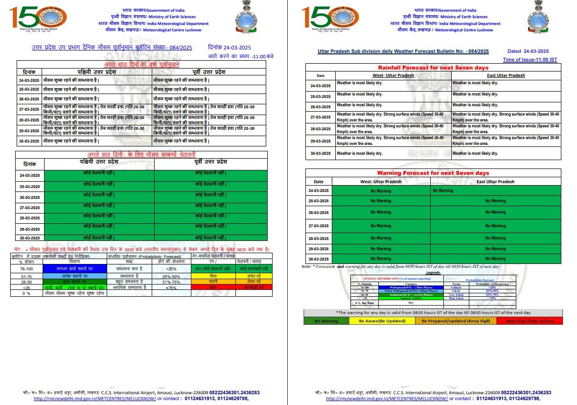 - 29 मार्च को पश्चिमी व पूर्वी यूपी में मौसम साफ रहने के साथ ही 20 से 30 किलोमीटर प्रति घंटा की रफ्तार से तेज हवा चल सकती है।