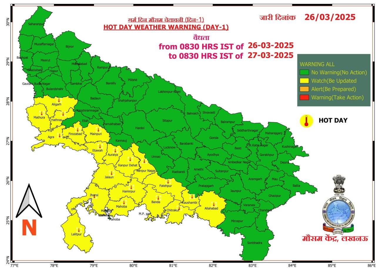 आज गुरूवार को बांदा, चित्रकूट, कौशाम्बी, प्रयागराज, फतेहपुर, प्रतापगढ़ , सोनभद्र , मिर्जापुर, चंदौली, वाराणसी, संत रविदास नगर, कानपुर नगर, रायबरेली और उसके आस-पास के इलाकों में उष्ण दिन (हॉट डे) का अलर्ट जारी किया गया है।