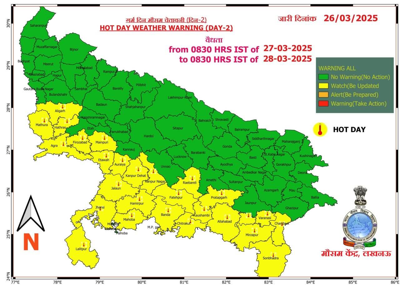- 28 मार्च को प्रदेश में मौसम साफ रहेगा। प्रदेश के दोनों हिस्सों में 20 से 30 किलोमीटर प्रति घंटा की रफ्तार से तेज हवा चल सकती है। पूर्वी यूपी में दक्षिण भाग में कहीं-कहीं पर हॉट डे का भी अलर्ट।