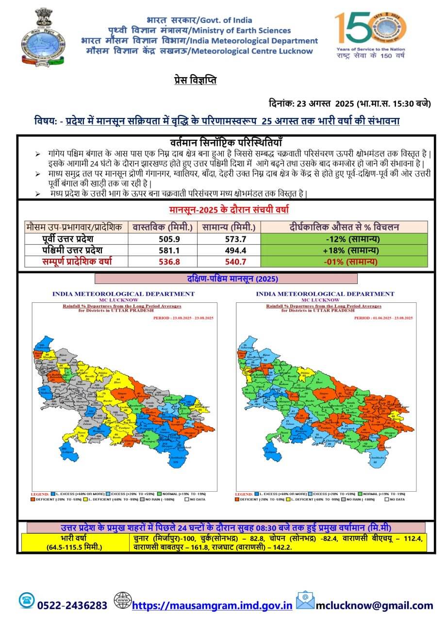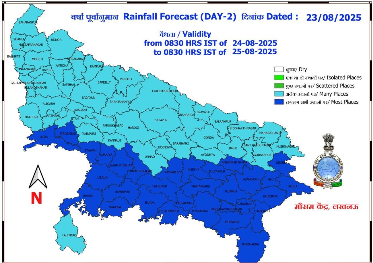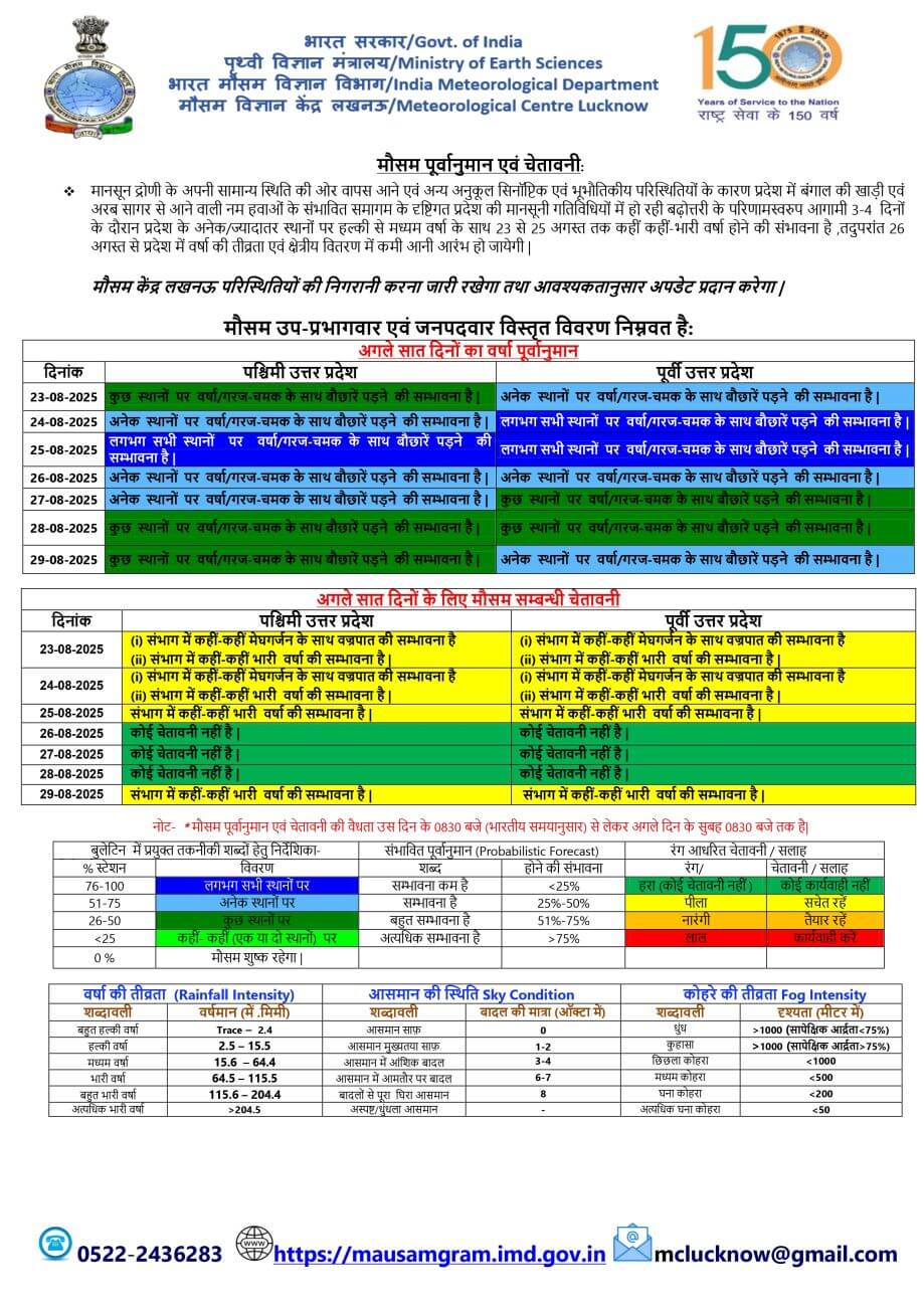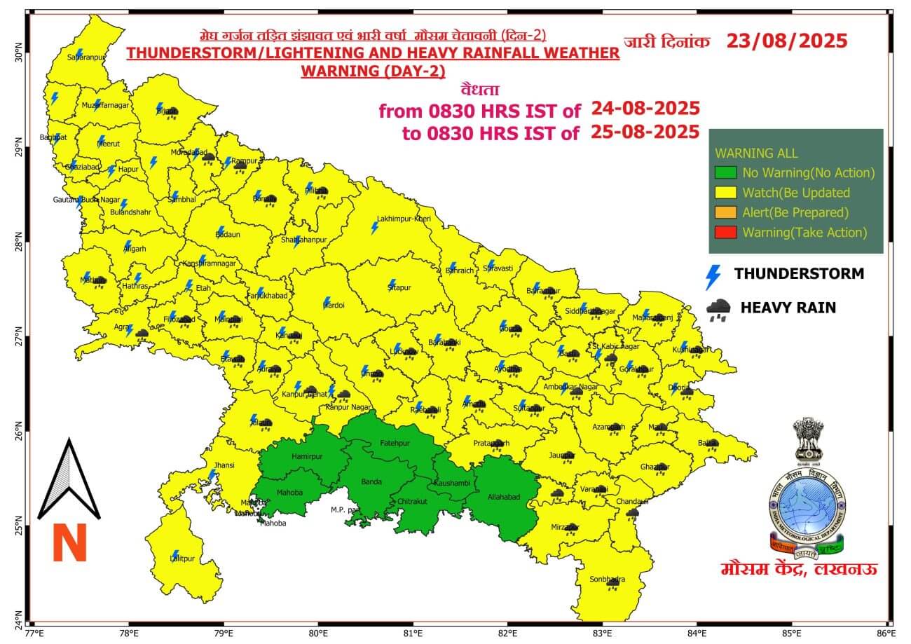 - 24-08-2025: पश्चिमी में अनेक / पूर्वी यूपी में लगभग सभी स्थानों पर वर्षा/गरज-चमक के साथ बौछारें । कहीं कहीं भारी से अति भारी बारिश, मेघगर्जन, वज्रपात