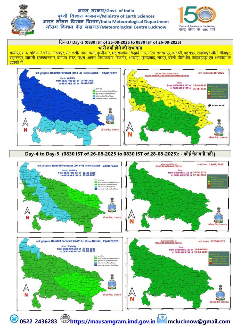 - 26-08-2025: पश्चिमी / पूर्वी यूपी में अनेक स्थानों पर वर्षा/गरज-चमक के साथ बौछारें ।