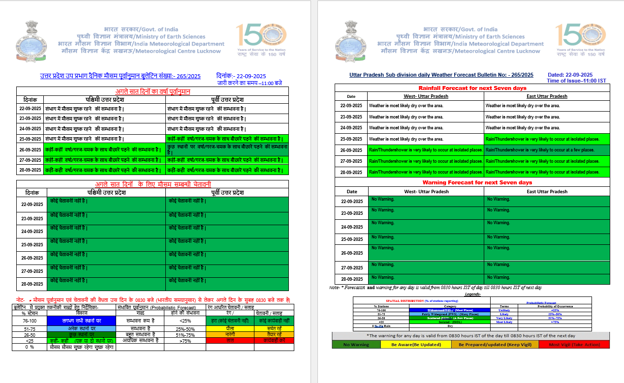 - 22-09-2025: पश्चिमी / पूर्वी यूपी में मौसम शुष्क ।