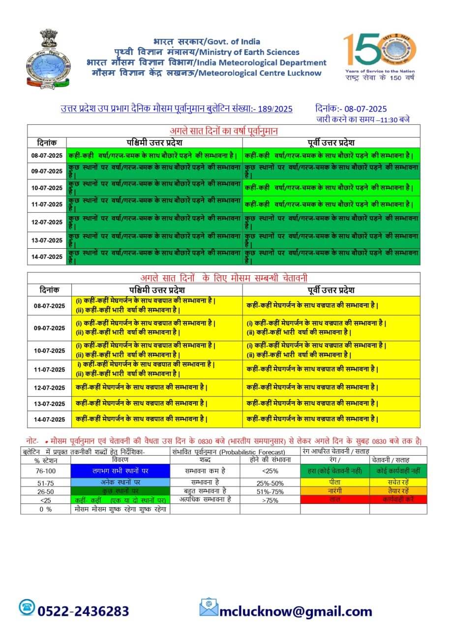 - 09-07-2025: पश्चिमी / पूर्वी यूपी में अनेक स्थानों पर वर्षा/गरज-चमक के साथ बौछारें ।कहीं-कहीं मेघगर्जन के साथ वज्रपात /भारी वर्षा।