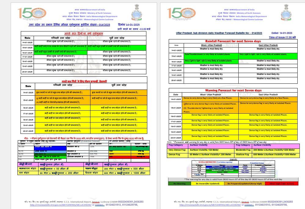UP Weather Alert Today : आज मकर संक्रांति के मौके पर पश्चिमी और पूर्वी यूपी में मौसम साफ रहेगा लेकिन इस दौरान दोनों हिस्सों में कहीं-कहीं पर मध्यम से घना कोहरा छाने की संभावना जताई गई है।आज 14 जनवरी को एक नया पश्चिमी विक्षोभ सक्रिय होने जा रहा है जिसके प्रभाव से 15-16 जनवरी को प्रदेश में बादल बारिश की स्थिति बनेगी।बुधवार को बुंदेलखंड और अवध क्षेत्र में भी बूंदाबांदी होगी।