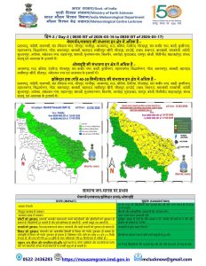 - सहारनपुर, शामली, मुजफ्फरनगर, बागपत, बिजनौर, बागपत, मेरठ, नोएडा, ग़ाज़ियाबाद, हापुड़, बुलंदशहर, अमरोहा, संभल, मुरादाबाद, रामपुर, बरेली, पीलीभीत, लखीमपुर खीरी, बहराइच, श्रावस्ती, बलरामपुर व आसपास के इलाकों में मेघ गर्जन और तेज बारिश के साथ 40-50 किमी प्रति घंटे की रफ़्तार से तेज सतही हवाएं चलने का अनुमान है।