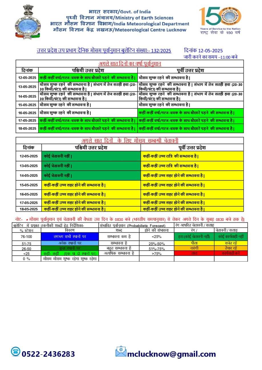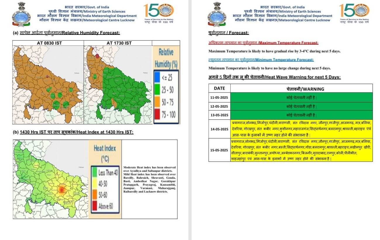 17-18 मई को पूर्वी और पश्चिमी दोनों क्षेत्रों में हल्की बारिश होने का अनुमान है। अगले 5 दिनों के दौरान अधिकतम तापमान में 3-4°C की बढ़ोतरी और न्यूनतम तापमान में कोई बड़ा परिवर्तन होने की संभावना नहीं है। 14 मई से कहीं-कहीं उष्ण लहर की स्थिति बन सकती है। लखनऊ, वाराणसी, प्रयागराज समेत कई जिलों में अधिकतम तापमान 40℃ के पार पहुंच गया है।
