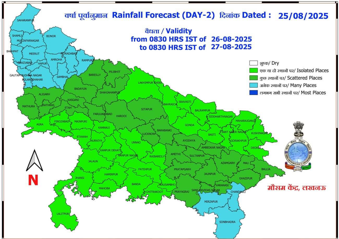 - 26-08-2025: पश्चिमी / पूर्वी यूपी में अनेक स्थानों पर वर्षा/गरज-चमक के साथ बौछारें ।