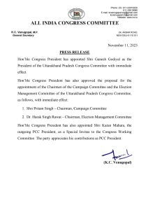 कांग्रेस महासचिव केसी वेणुगोपाल द्वारा जारी एक आधिकारिक विज्ञप्ति में इन नियुक्तियों की जानकारी दी गई। इस बदलाव के तहत पार्टी ने राज्य के अन्य वरिष्ठ नेताओं को भी महत्वपूर्ण जिम्मेदारियां सौंपी हैं ताकि चुनावी तैयारियों को धार दी जा सके।