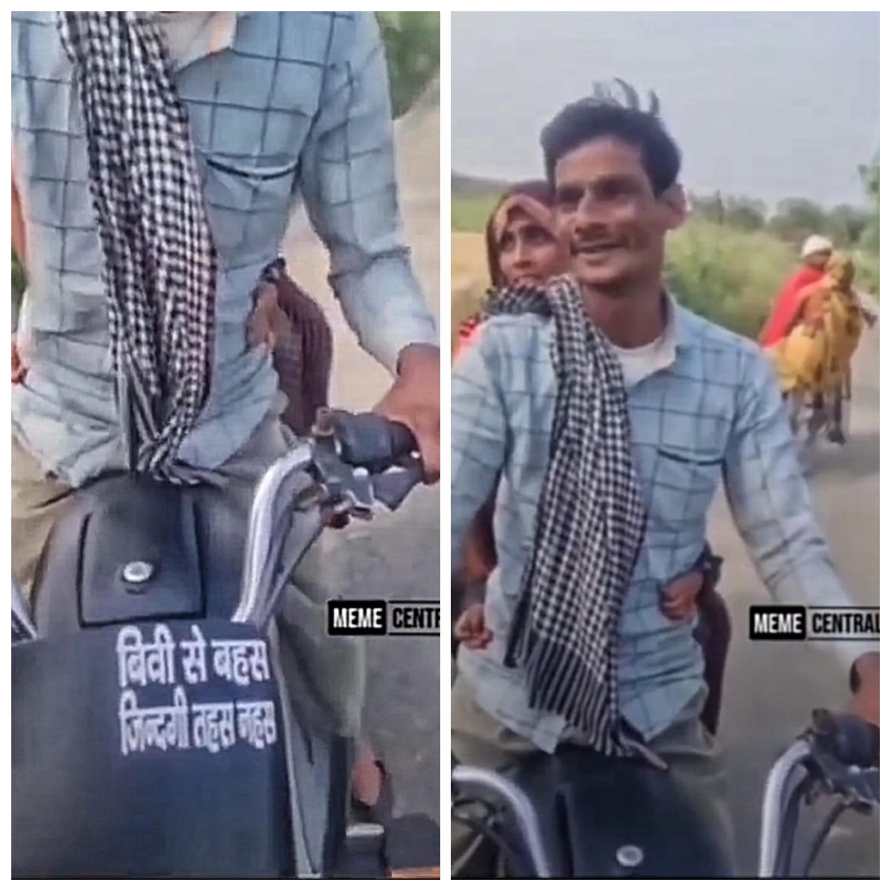 इस वीडियो में एक बाइक दिख रही है और बाइक पर जो कैप्शन लिखा है उसने सभी का ध्यान अपनी ओर खींचा है। इसपर लिखा है “बीवी से बहस, जिंदगी तहस नहस”। वीडियो में एक शख्स अपनी बीवी के साथ बाइक पर बैठा दिख रहा है और जब उससे पूछा जा रहा है कि ये क्या लिखा है आपने अपनी गाड़ी पर तो वो इसे पढ़कर भी बता रहा है। इस वीडियो पर अब ढेर सारे कमेंट्स और लाइक्स आ रहे हैं। एक यूज़र ने लिखा है कि ‘सही तो लिखा है भाई ने’। ये वीडियो काफी पसंद किया जा रहा है और लोग इसपर जमकर मज़े ले रहे हैं।
