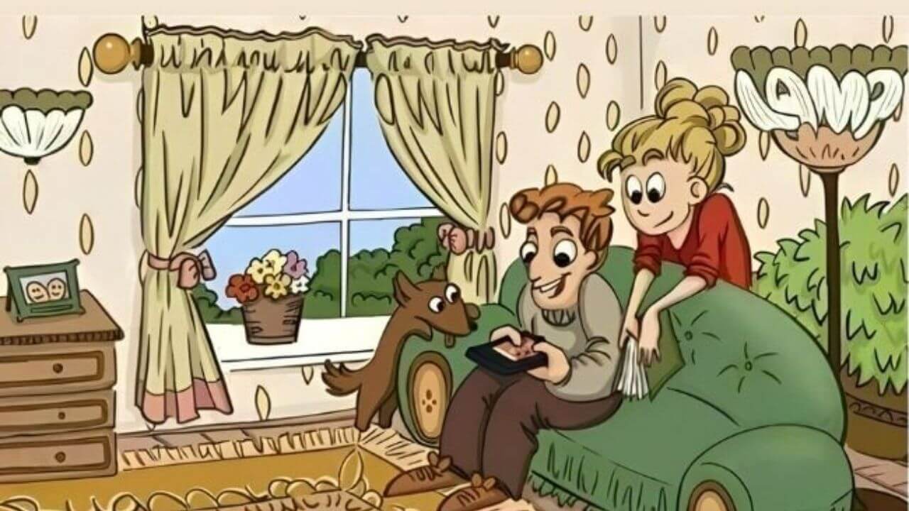 आज का टेस्ट भी बहुत मज़ेदार है, आपके सामने एक तस्वीर मौजूद है, जिसमें आपको ड्राइंग रूम का नज़ारा दिखाई दे रहा होगा, ये नज़ारा आपको बहत ही आम लग रहा होगा, लेकिन इसमें कुछ राज है. जैसा कि आप तस्वीर में देख सकते हैं, कि पति और पत्नी दोनों मोबाइल में व्यस्त हैं, पत्नी के हाथ में किताब है लेकिन उसका ध्यान मोबाइल में है. साथ ही उनके साथ उनका पालतू कुत्ता भी है जो कि सोफ़े पर चढ़ने की कोशिश कर रहा है, लेकिन इसके अलावा तस्वीर में और भी कई चीज़ें ऐसी हैं जो शायद आप को दिखाई नहीं दे रही है.