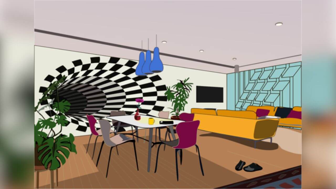 कमरे की दीवार पर एक काले और सफेद रंग का पोर्टल है, जो चुनौती को और भी बढ़ा देता है। इसके अलग-अलग पैटर्न आंखों को भटका देते हैं। जिससे ध्यान लगाना मुश्किल हो जाता है। इसके अलावा चमकीले नारंगी सोफे और गुलाबी कुर्सियों के रंग भी चाबी को खोजने में मुश्किलें पैदा कर सकते हैं।
