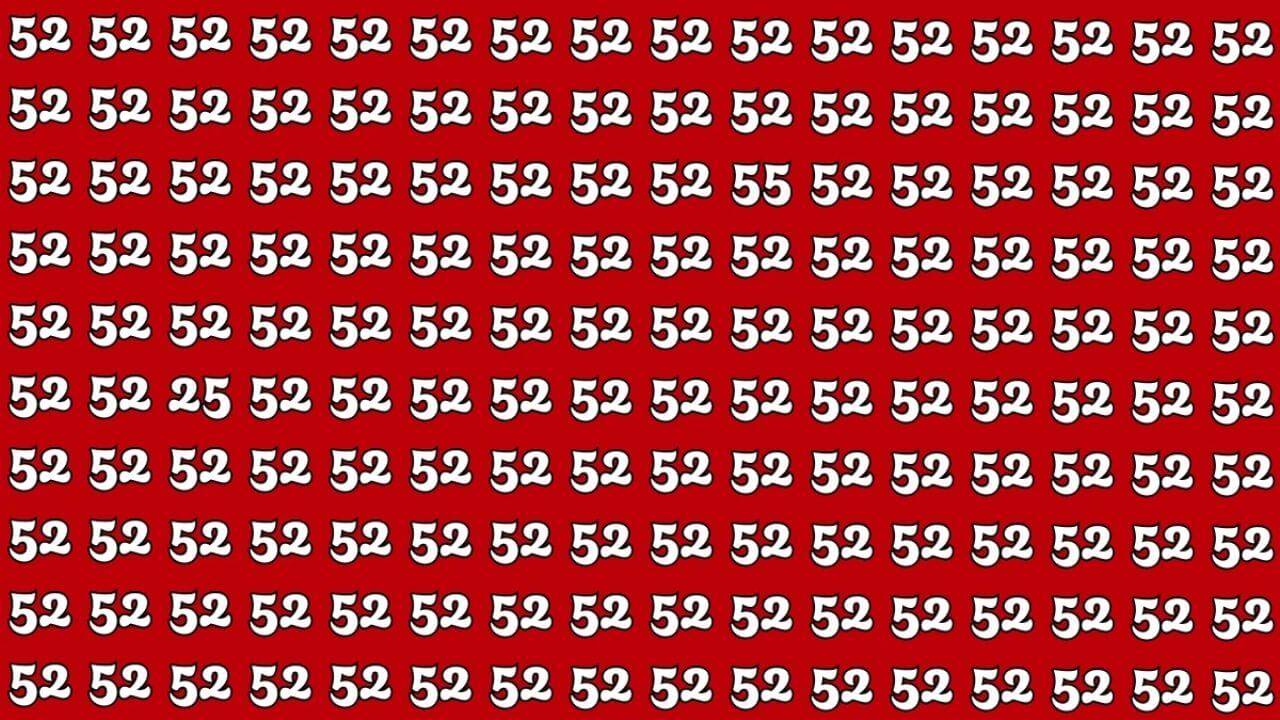 इस वायरल ऑप्टिकल इल्यूजन में पूरे इमेज को 52 से भरा गया है। लेकिन इसमें कहीं ना कहीं 25 और 55 भी छुपे हैं। इन्हें पहचानने के लिए आपको अपनी नजरों को स्क्रीन पर स्कैन करना होगा। टिप ये है कि पूरे इमेज को एक बार में देखने की बजाय सेक्शन वाइज देखें, जैसे ऊपर की लाइन, फिर बीच और आखिर में नीचे। कई यूज़र्स ने माना कि वो दोनों नंबर सिर्फ 5-6 सेकंड में ढूंढ पाए, वहीं कुछ को 20 सेकंड भी लगे।