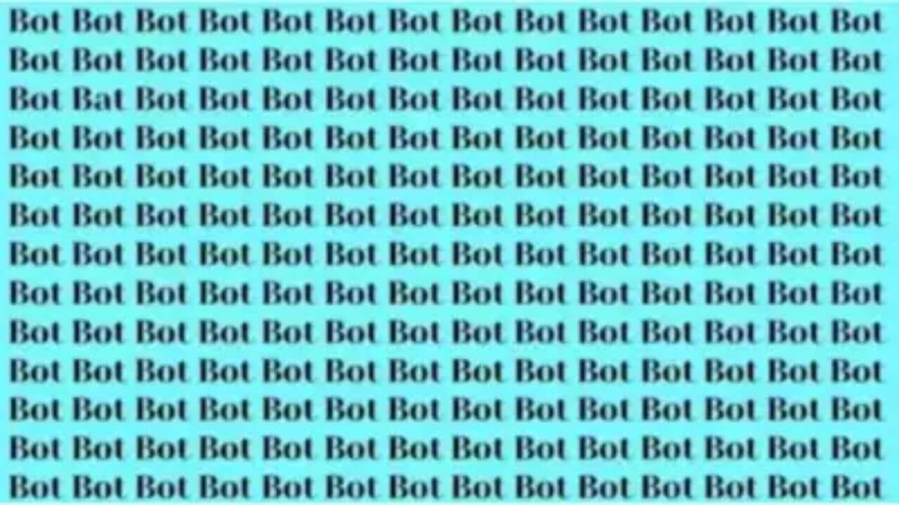 इस नीले और काले रंग के चित्र में Bat शब्द कहीं ना कहीं छिपा हुआ है। हालांकि इसे अन्य शब्दों यानी Bot से घेर रखा गया है। यहां आपके लिए एक बड़ी चुनौती बनाता है, क्योंकि आपको ध्यानपूर्वक देखने की आवश्यकता है, ताकि आप इस अजीब शब्द को पहचान सकें।