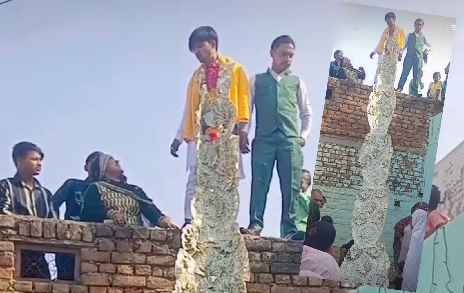 शादी के दौरान कई स्थानों पर दूल्हे के गले में नोटों की माला डालने का चलन रहा है। अक्सर ही ये माला नकली नोटों से बनाई जाती है। लेकिन कई बार अगर किसी के पास पैसे ज्यादा ही हों, तो वो असली नोटों की माला भी पहन लेता। ऐसे में दस हजार, बीस हजार, यहां तक कि पचास हजार के नोटों की माला भी समझ में आती है। लेकिन यहां जो दूल्हा नजर आ रहा है उसने 20 लाख की माला पहनी है। इस वीडियो में एक दूल्हा है जो अपने कुछ साथियों और आसपास के बच्चों के साथ एक छत पर खड़ा दिखाई दे रहा है। उसने इतनी लंबी नोटों की माला पहनी हुई है जो जमीन पर आने के बाद भी खतम नहीं हो रही है। माला में 500 के नोट नजर आ रहे हैं।