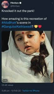 सोशल मीडिया पर पर वायरल बच्ची का अकाउंट को मैनेज उसके माता- पिता करते हैं । विडियो शेयर करते हुए फिल्मफेयर ने लिखा , “फिल्मफेयर ने लिखा, “इसे पार्क से बाहर कर दिया! गंगूबाई काठियावाड़ी में आलिया भट्ट के दृश्य का यह मनोरंजन कितना अद्भुत है?”